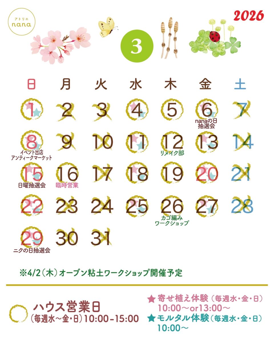 3月も基本的には毎週水・木・金・日曜の10時〜15時営業となります。(定休日:月・火・土曜)