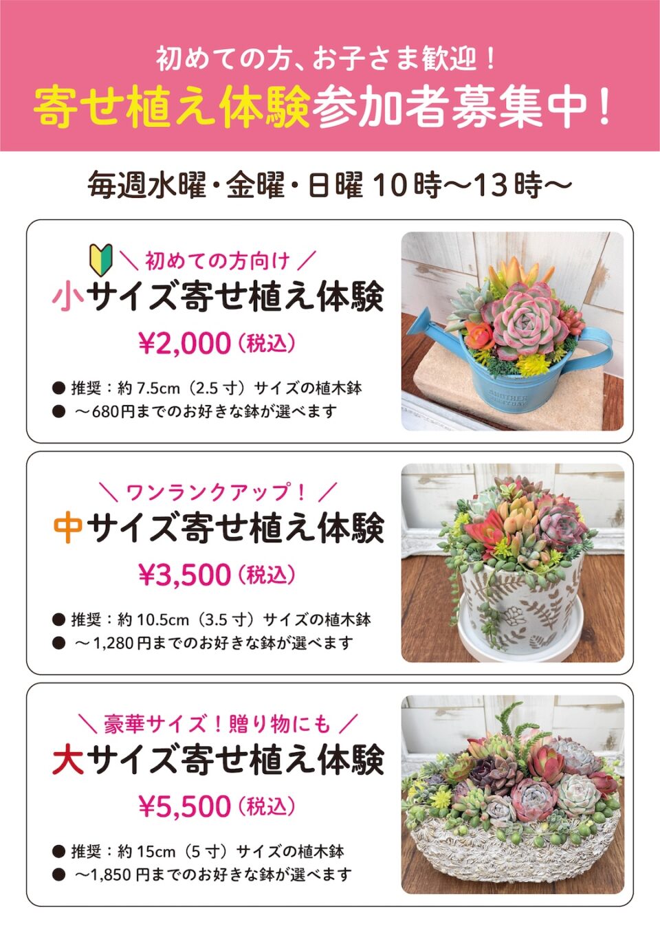 定番として小・中・大サイズの寄せ植え体験に加えて、数量限定の箱庭、カゴ、リースの寄せ植え体験が加わりました♪金額も明瞭になりましたので、この機会にぜひ寄せ植え体験にご参加ください☺️