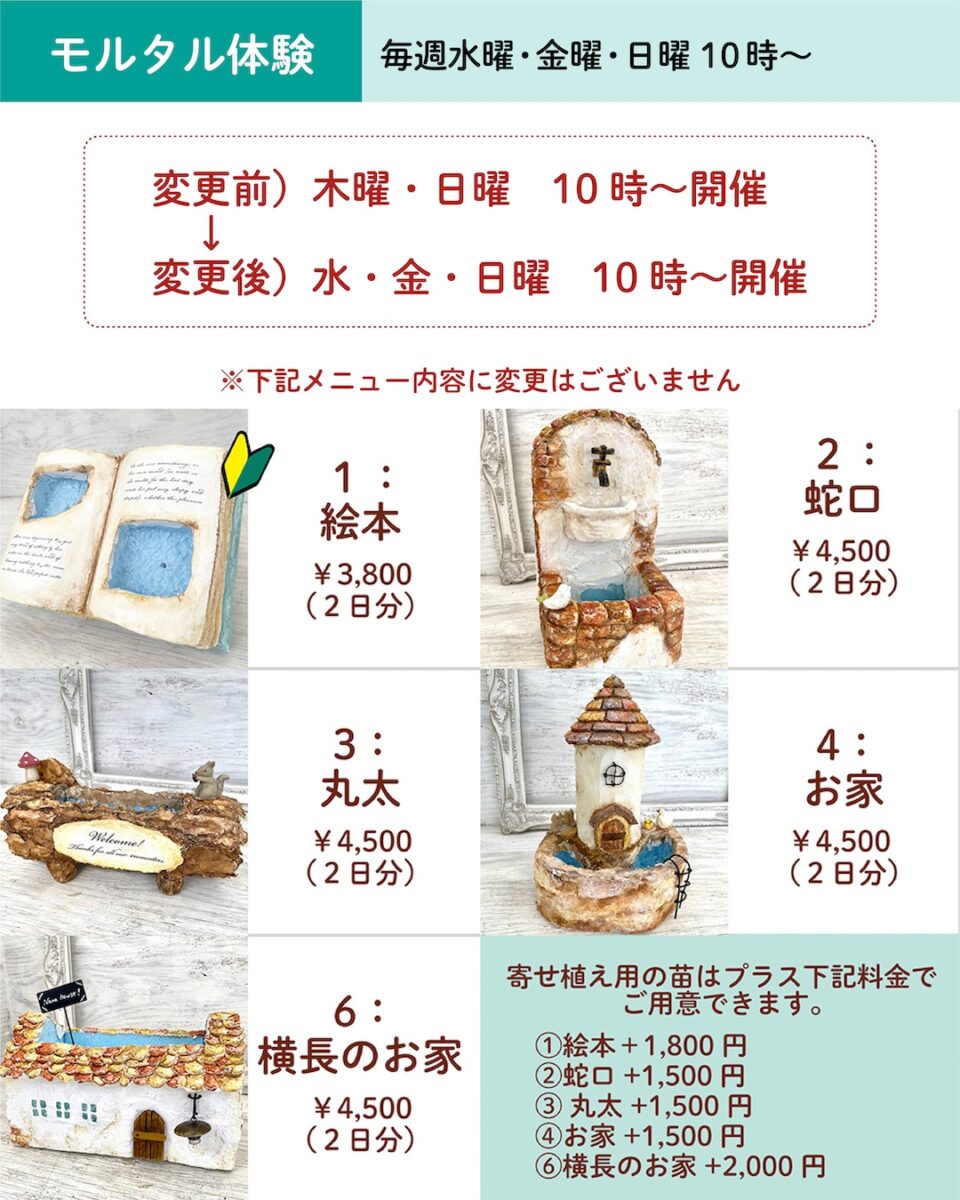 毎週木曜・日曜に開催していたモルタル体験ですが、寄せ植え体験と一緒に開催することにしたため、水・金・日曜の10時〜と変更させていただきます。
