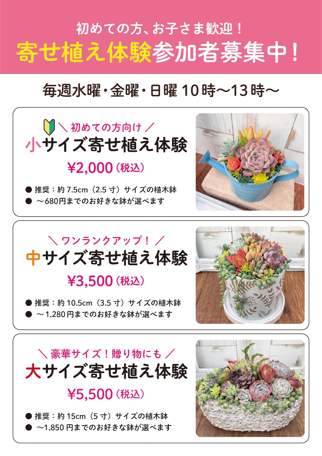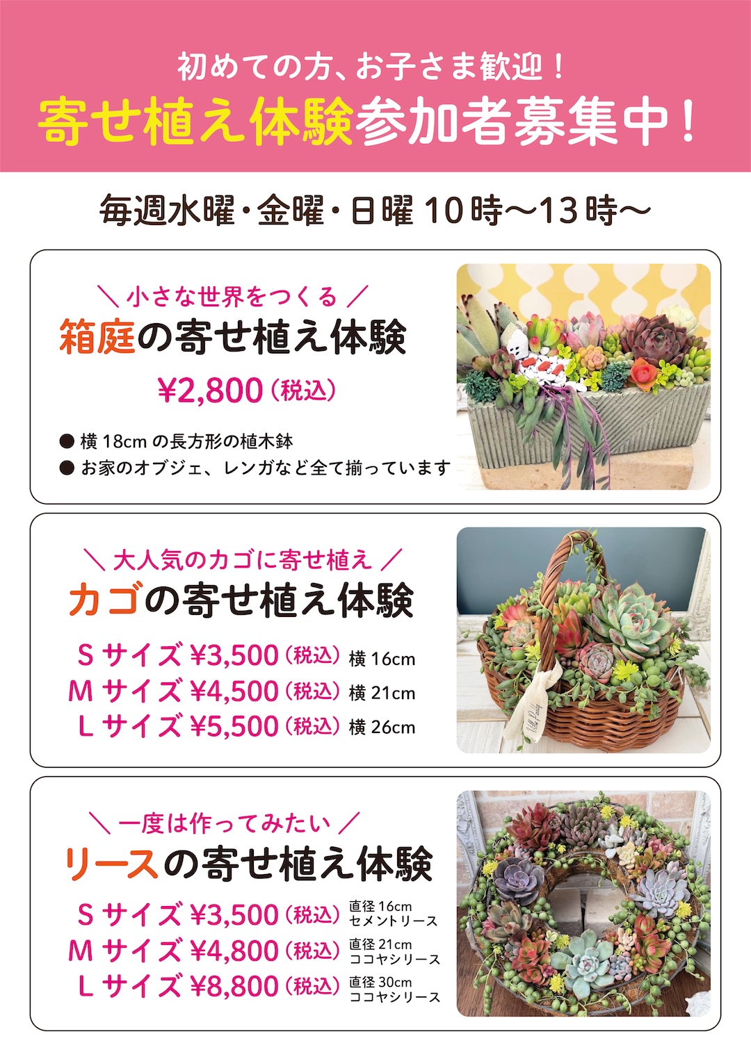 現在下記メニューの寄せ植え体験をおこなっています