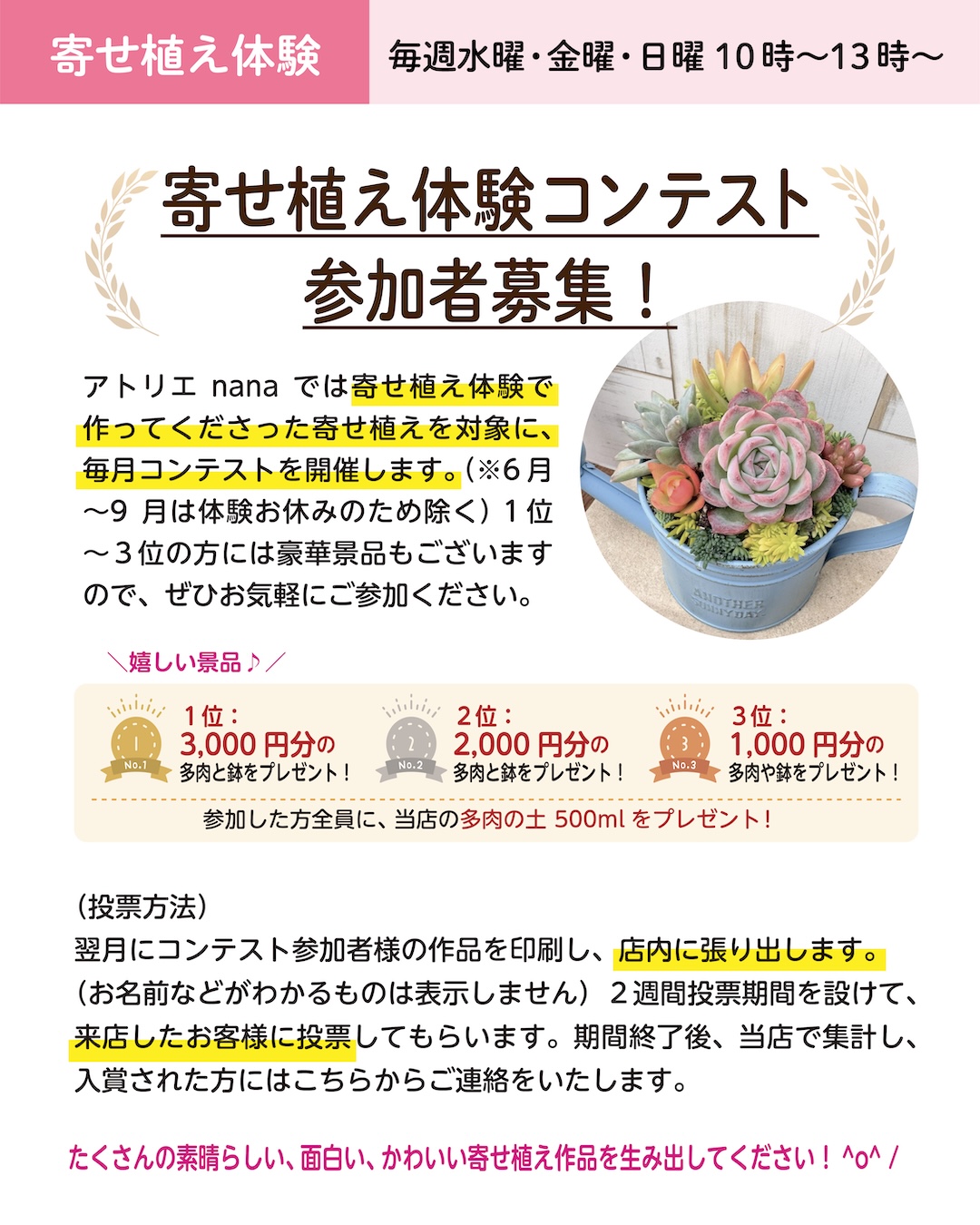 ①寄せ植え内容、②参加したい日時、③お名前、④参加人数をお知らせください。